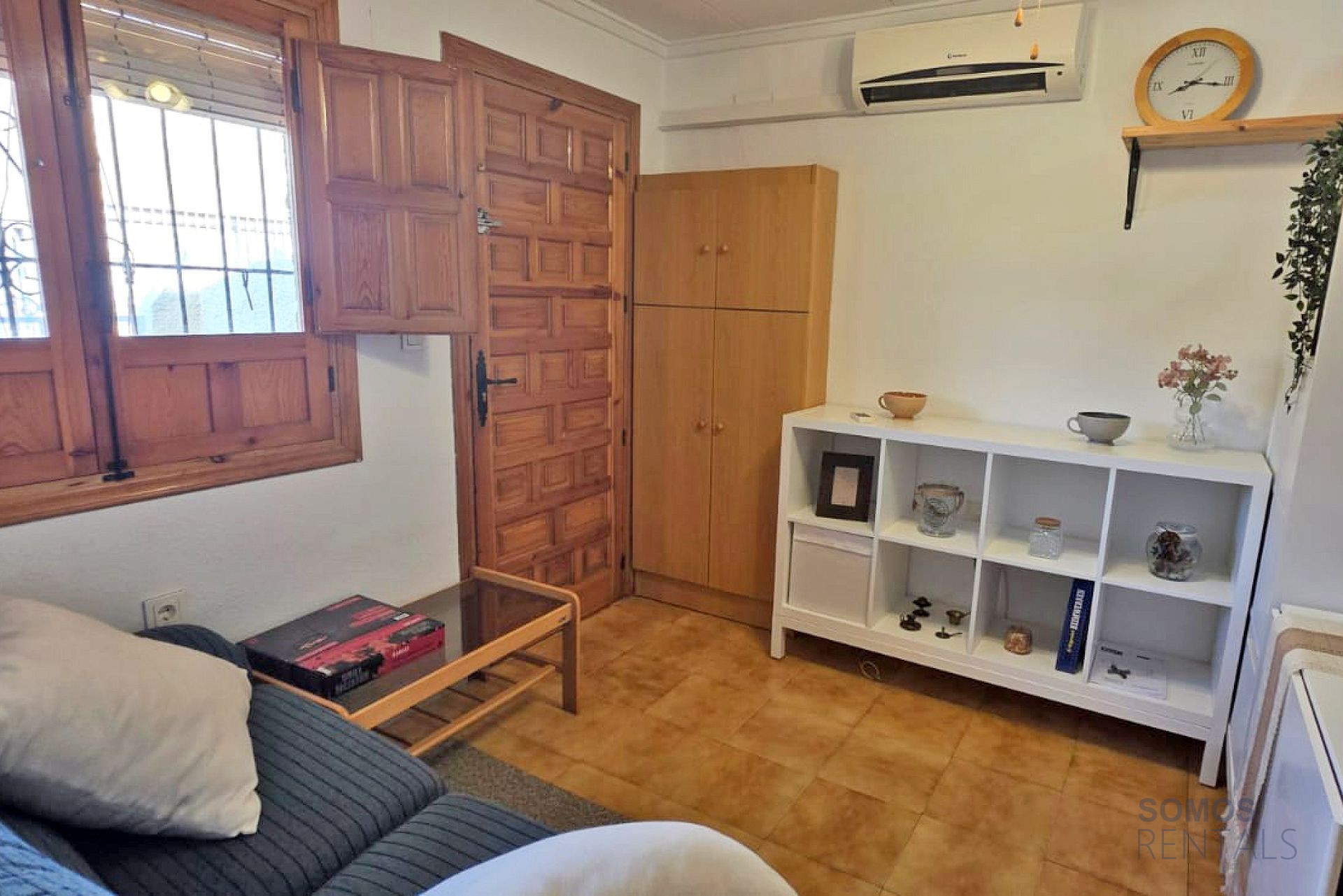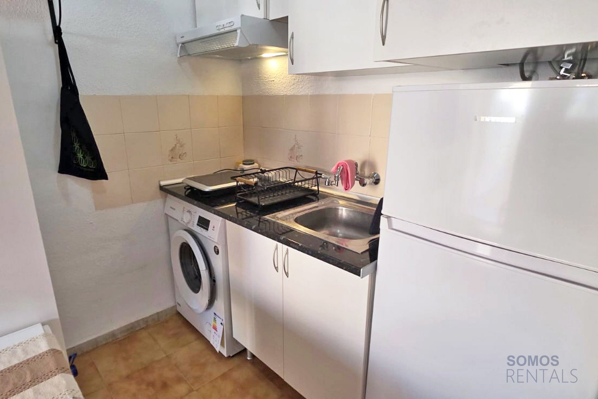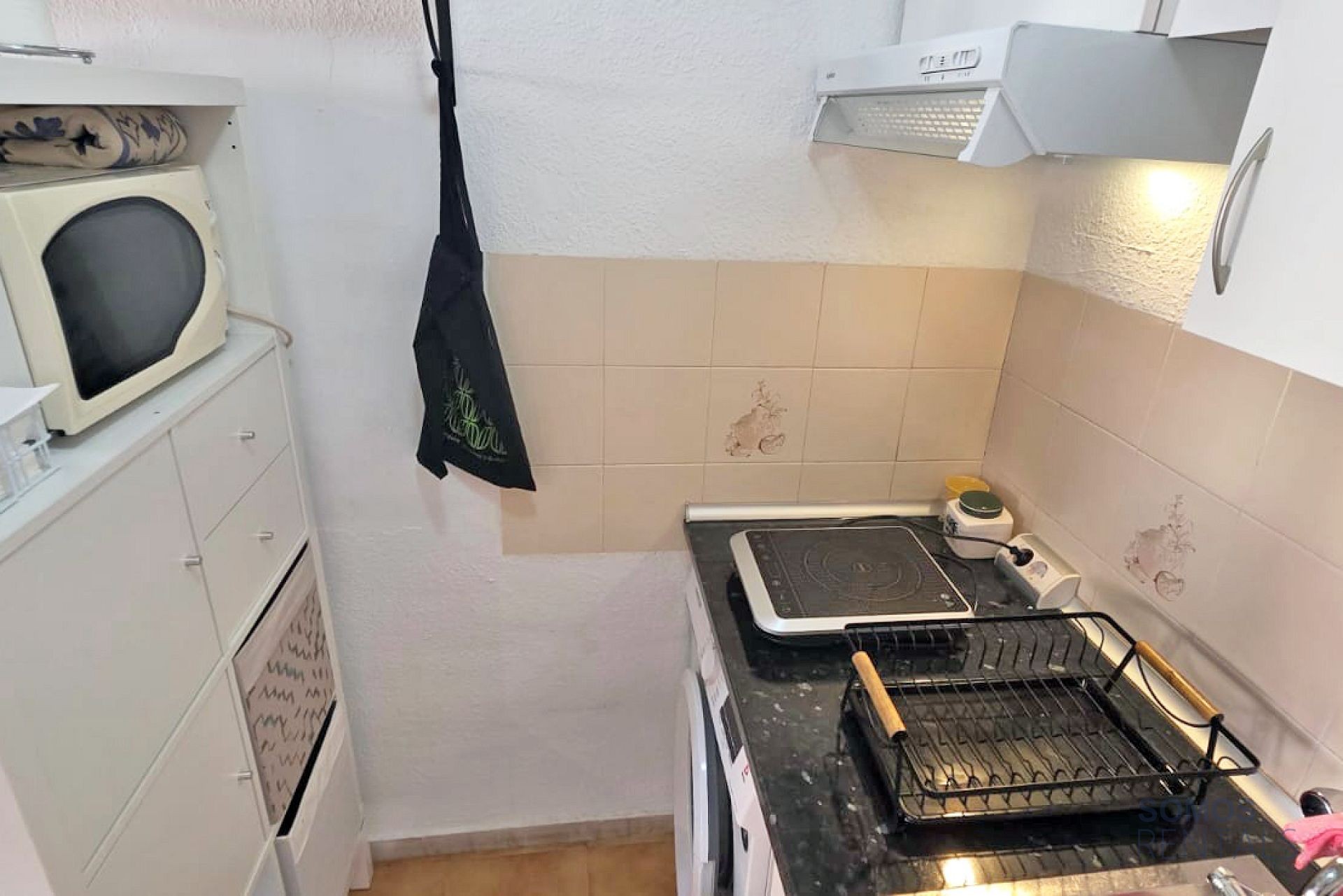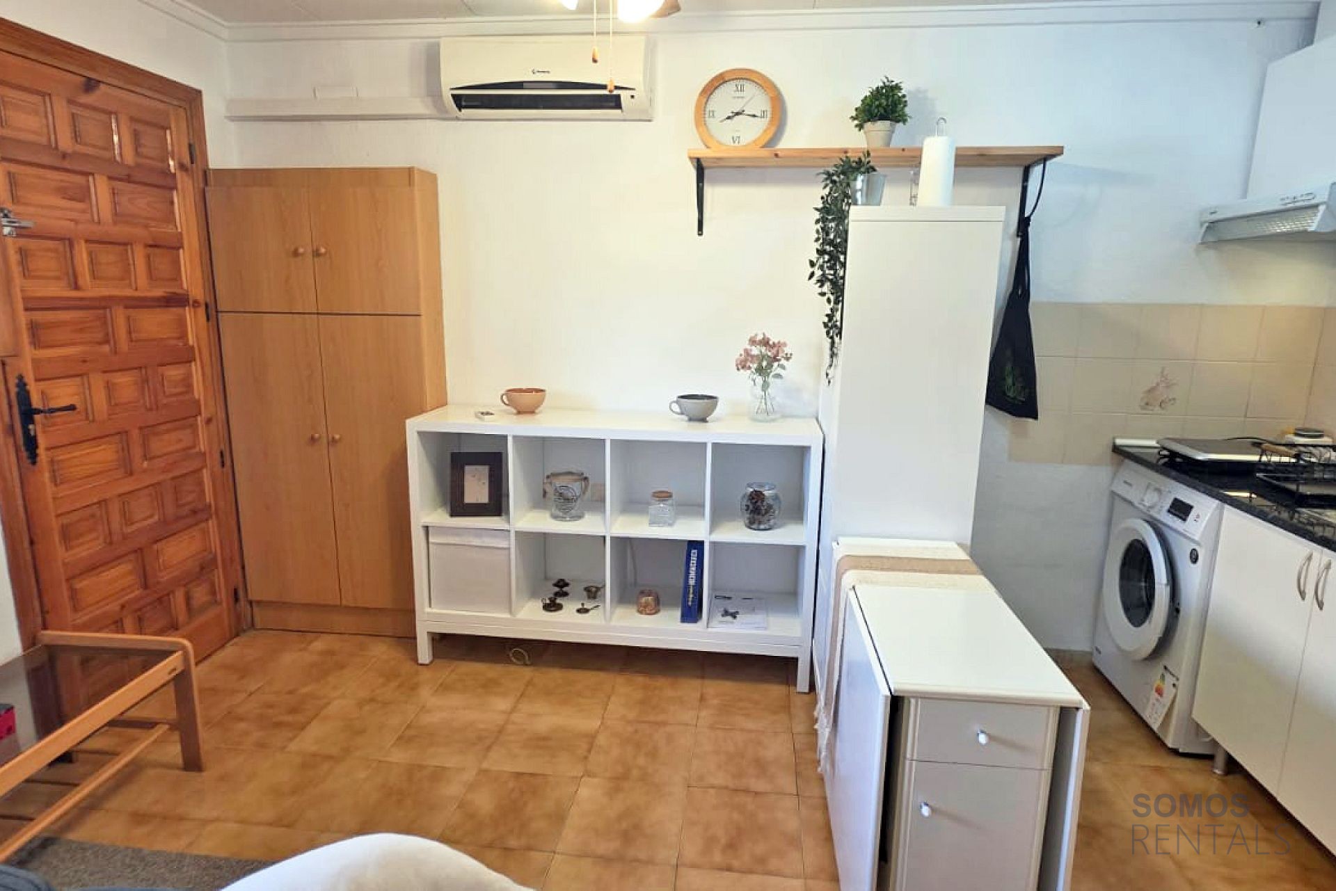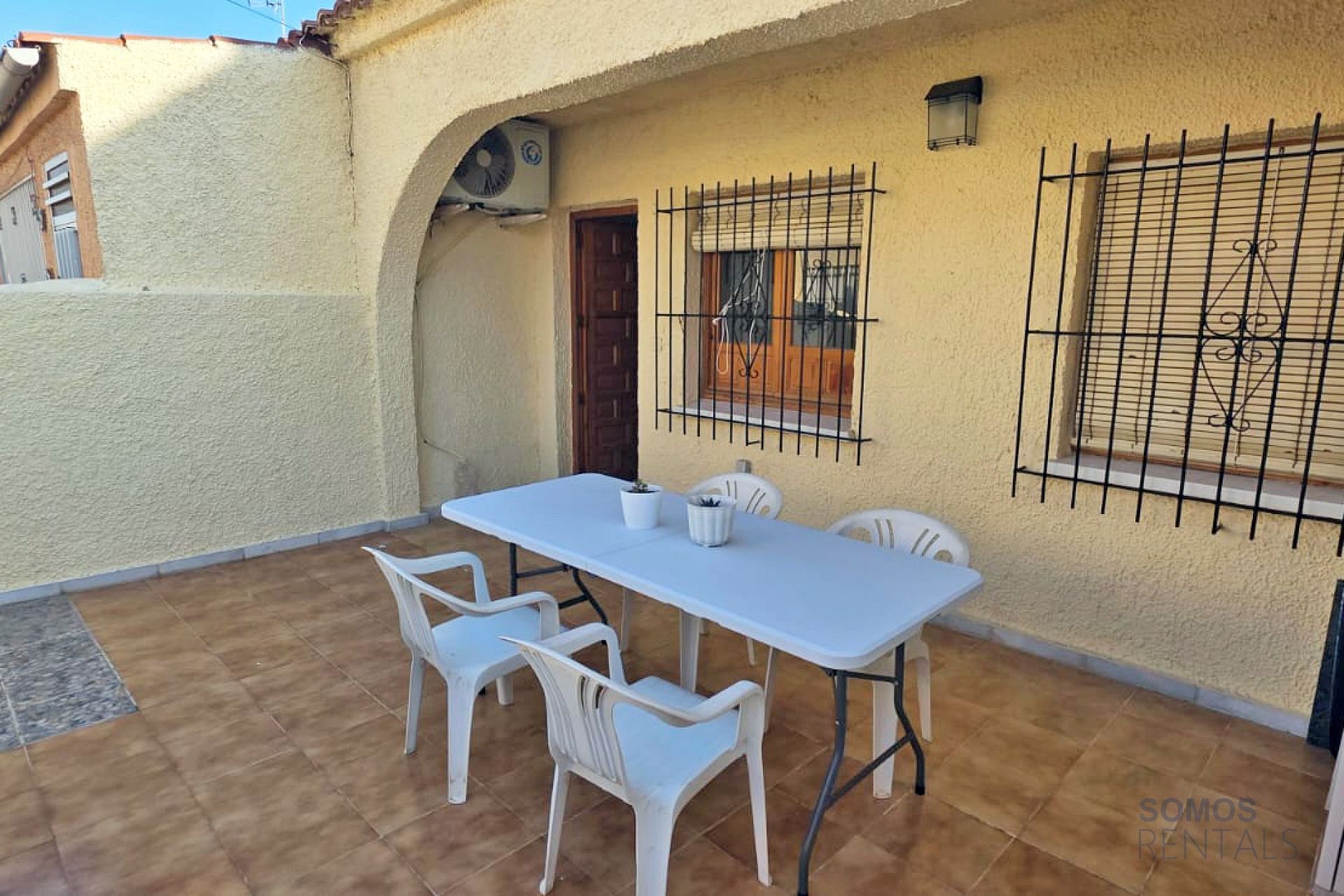 Situated in a quiet neighbourhood, the property has a spacious private front terrace with a storage cupboard and patio table and chairs. Inside, there is a lounge area with a sofa and sideboard, air conditioning, a kicthen with appliances including a fridge/freezer, washing machine, hot plate and a microwave. The bedroom has a double bed and wardrobe. The bathroom has a bath tub with shower above, wash basin and wc.